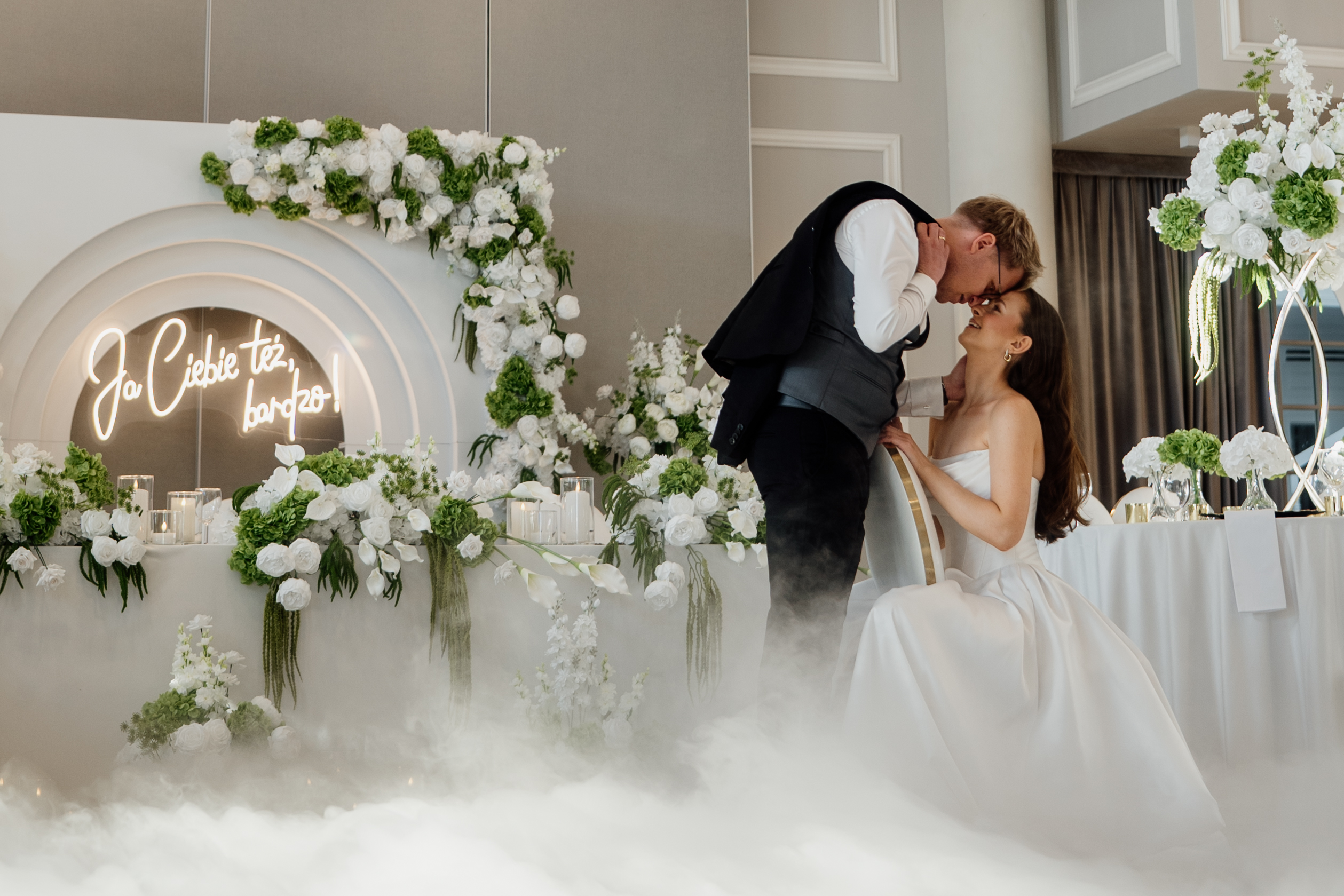 Ścianka biała z kwiatową ozdobą i dwoma postumentami z dekoracją kwiatową. Cena 1500 zł.